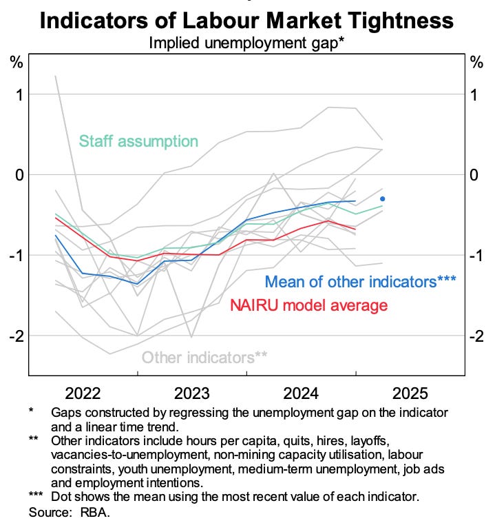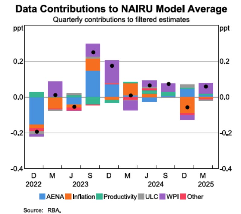 Through 2022 and the first half of 2023, the staff’s estimate (in teal) closely tracked the NAIRU model averages (in red). The RBA more or less took the models average output at face value - a fairly reasonable way of estimating the NAIRU!1