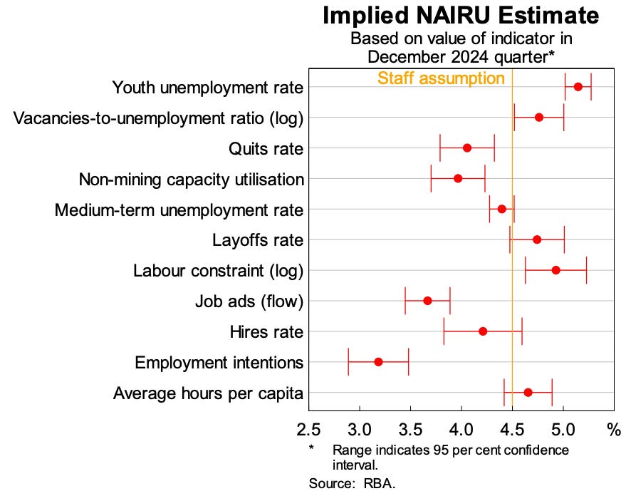 Since the second half of 2023, though, the two lines have diverged, with the staff NAIRU now sitting at least a quarter of a percentage point lower than the model averages. This is a result of the RBA applying judgement to the models’ output beyond what the core data suggests.